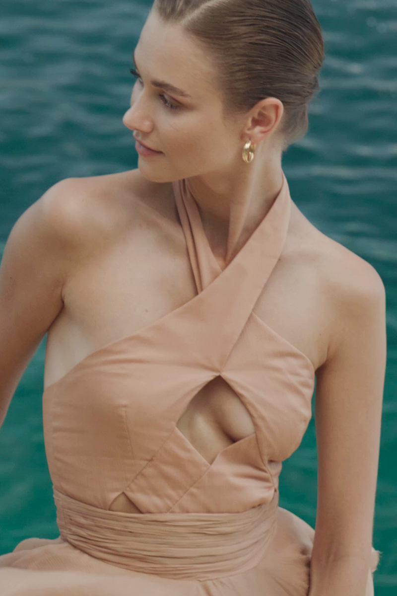 Figure-hugging halterneck cocktail dress made of silk with an asymmetric cut and cut-outs. Flowy, three-layered circle skirt with a side extension. Deep cut-out at the back. Hook fastening at the neck, concealed zip at the side.