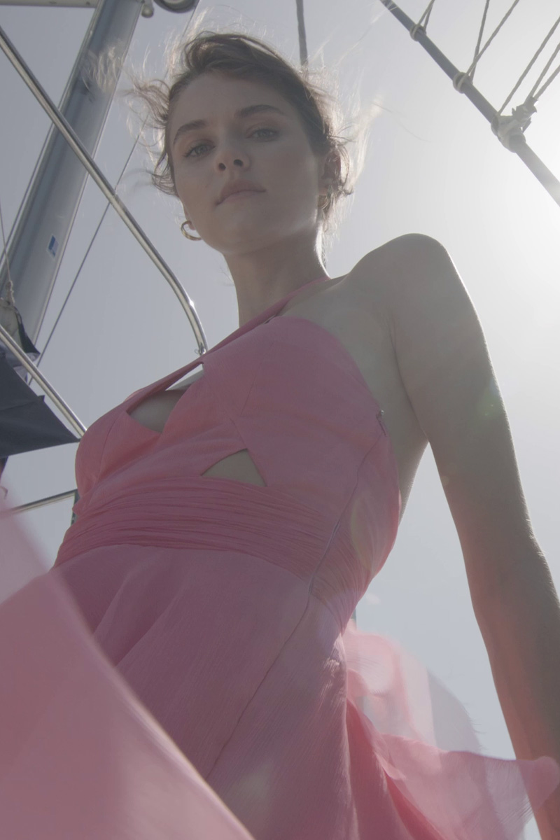 Figure-hugging halterneck cocktail dress made of silk with an asymmetric cut and cut-outs. Flowy, three-layered circle skirt with a side extension. Deep cut-out at the back. Hook fastening at the neck, concealed zip at the side.