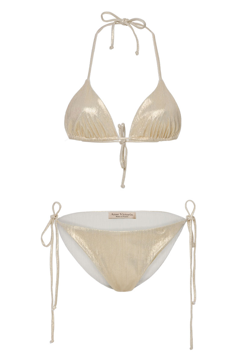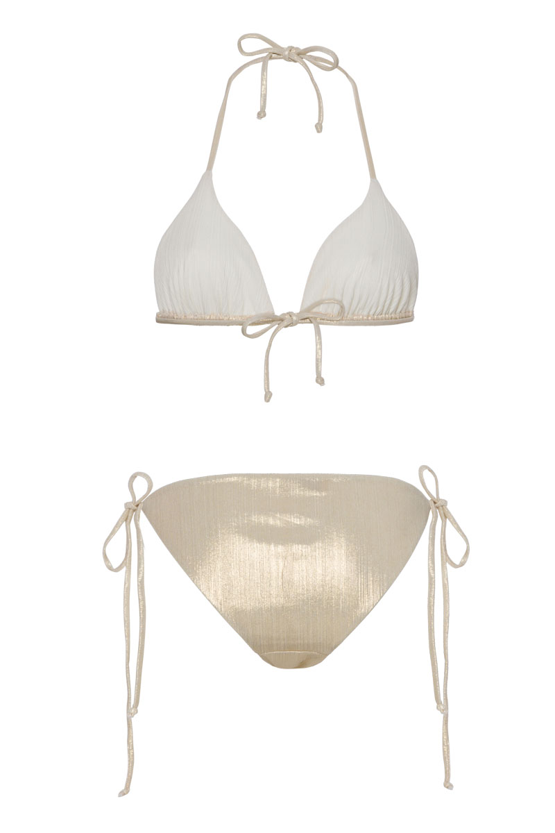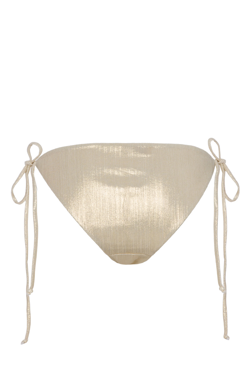 Bikini Höschen in goldener, strukturierter Metallic-Optik. Figurbetonter Low-Rise Schnitt, seitlich zu binden, indviduelle Passform. Atmungsaktives Material für ein angenehmes Tragegefühl auf der Haut.