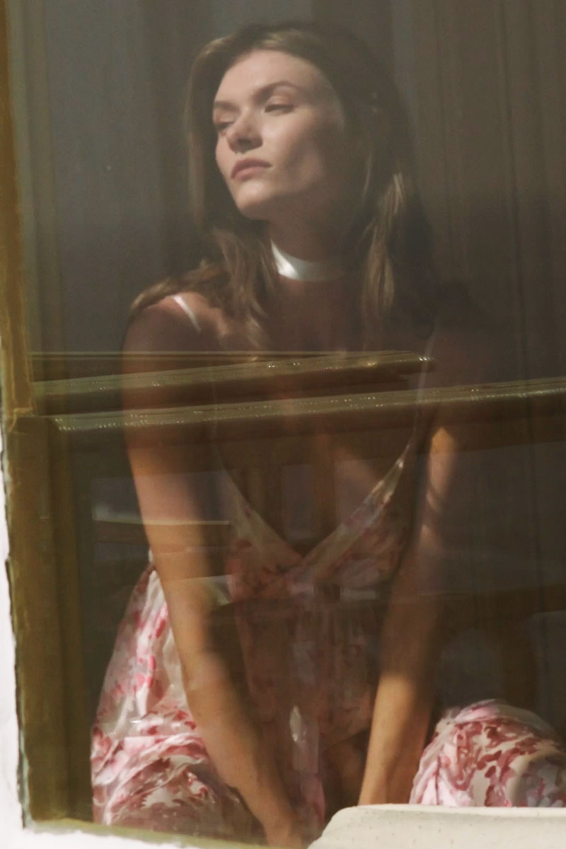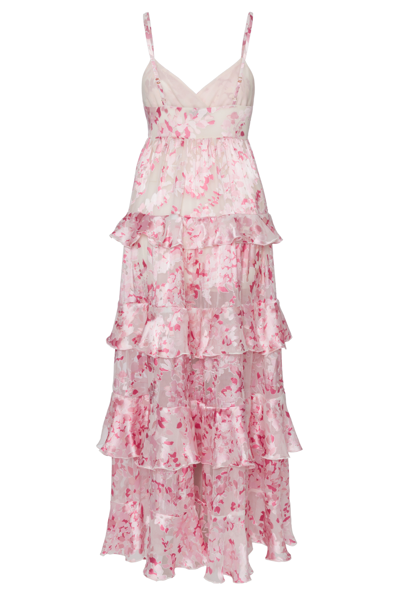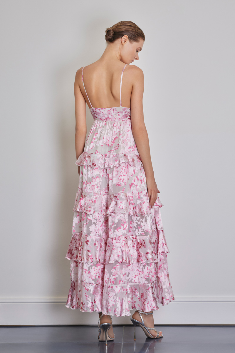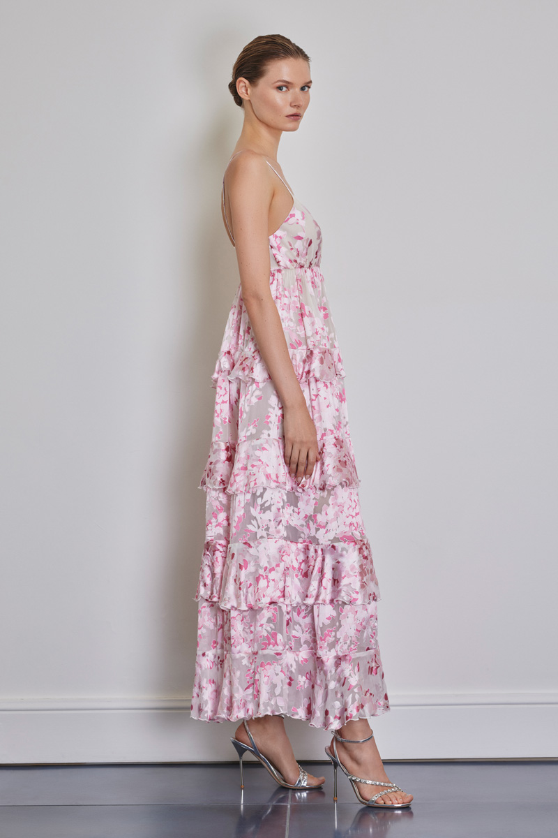 Zartes, bodenlanges Trägerkleid aus Seidenchiffon mit Volants und eingewebten, schimmernden Blüten auf weichem Ausbrenner-Stoff. Überlappender V-Auschnitt, verstellbare Träger.