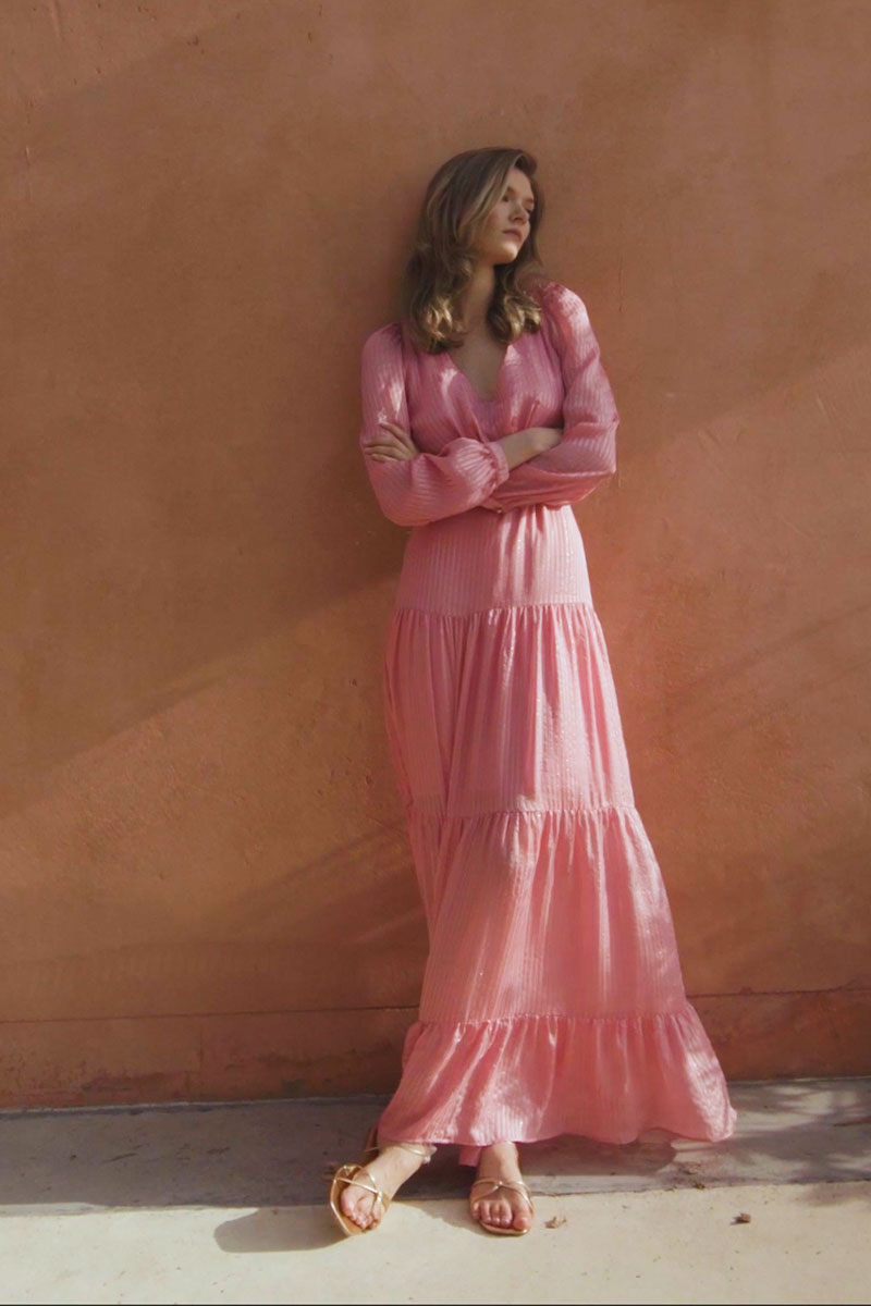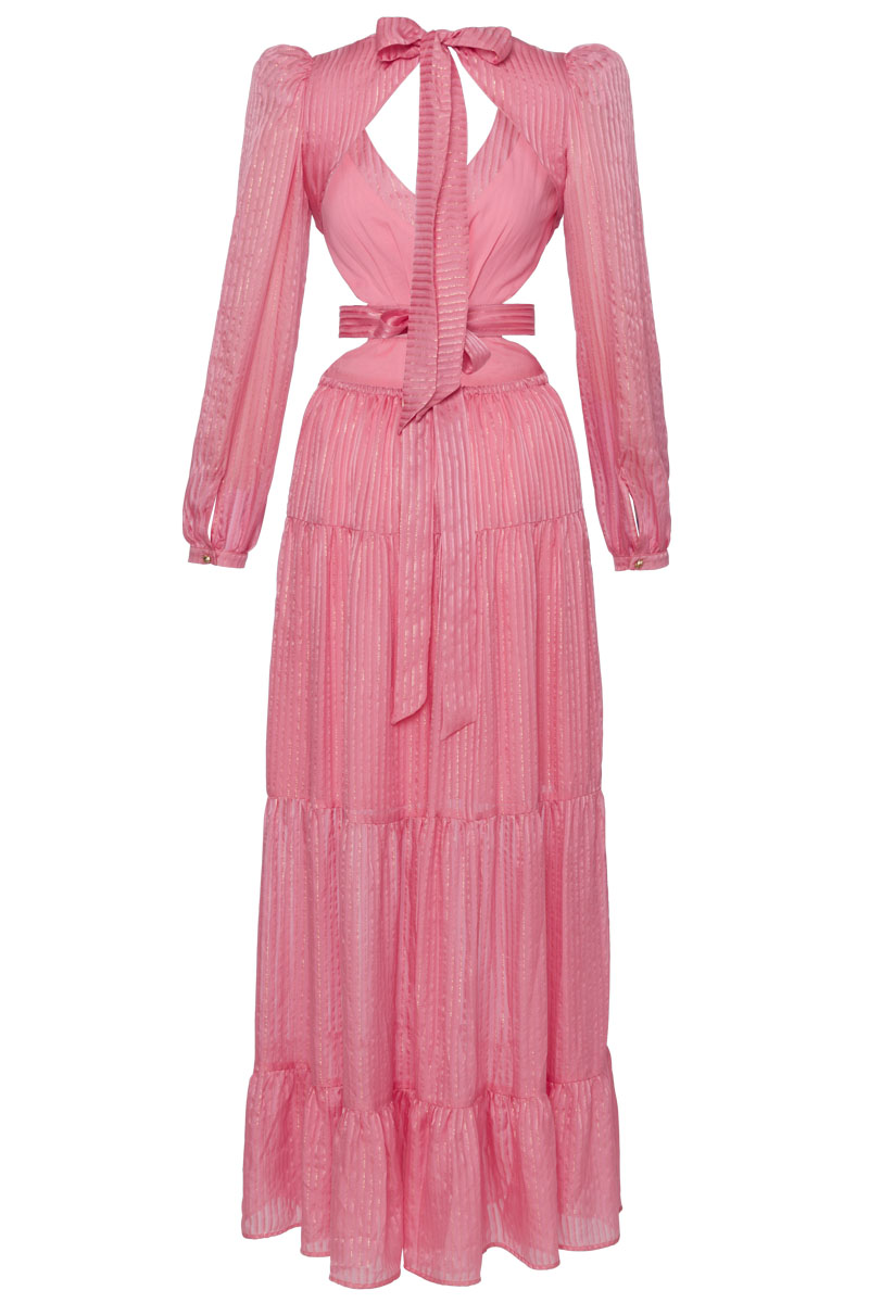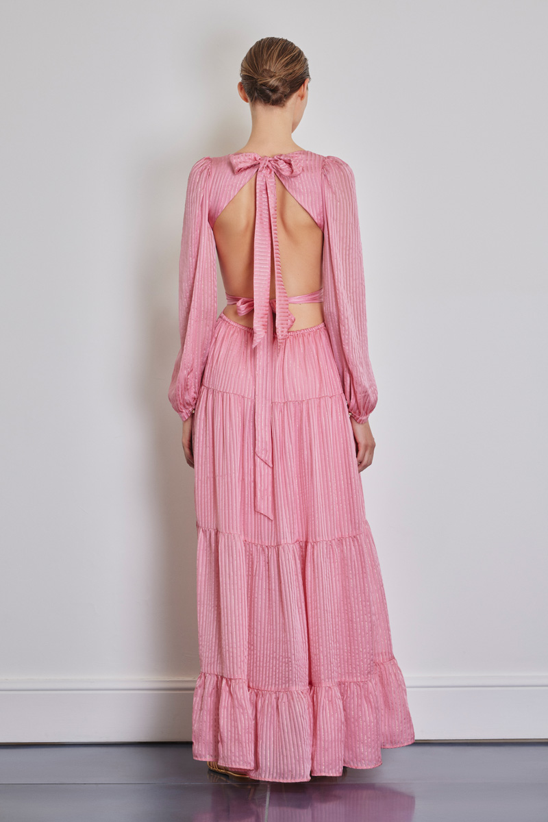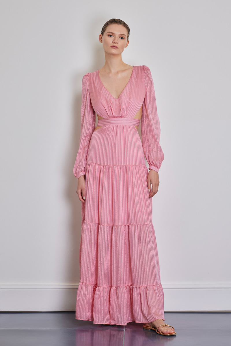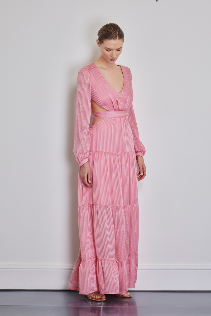 Elegantes, bodenlanges Seidenchiffon-Kleid mit Satinstreifen und zarten, goldenen Lurexfäden. Raffinierte Cut-Outs an der Seite und am Rücken. Im Nacken und in der Taille zu binden. Weite Puffärmel mit schmaler Manschette und Knopfverschluss.
