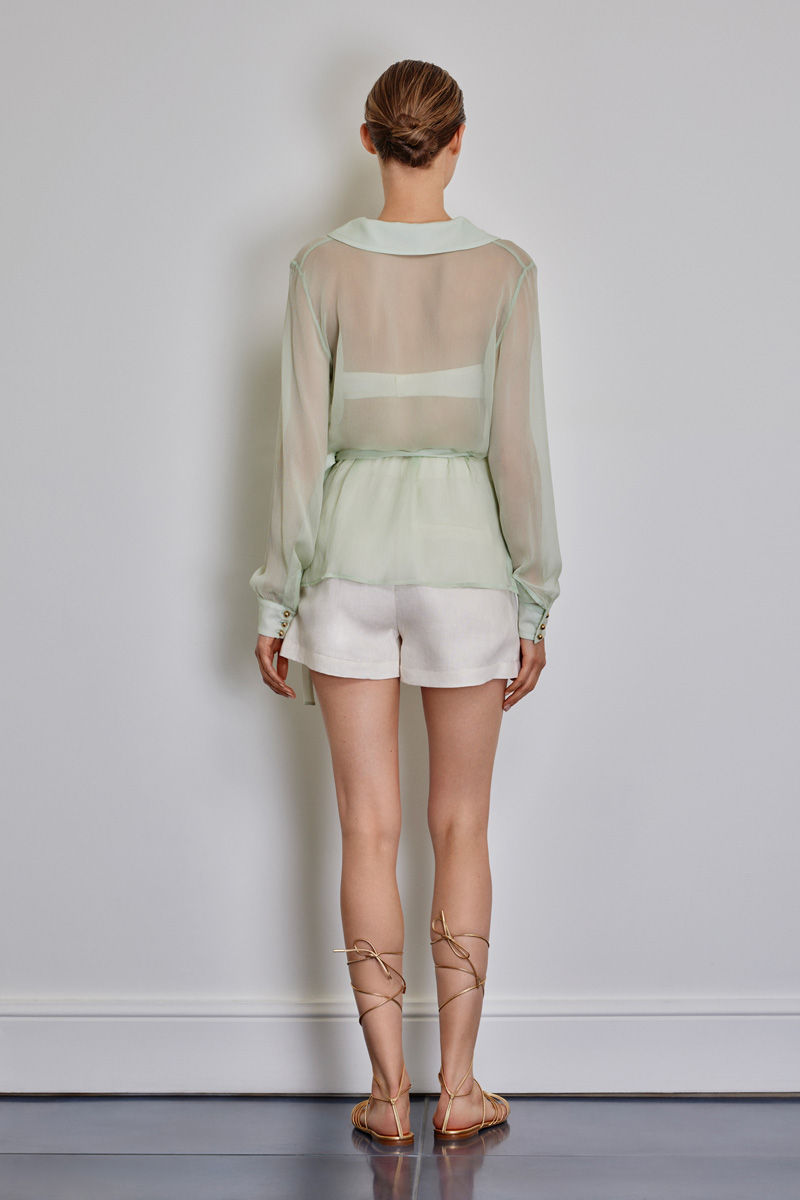 Luftige, hüftlange Wickelbluse aus feinem, transparentem Seiden-Chiffon. Lockerer Sitz, leichter, fließender Fall, in der Taille gebunden. Manschetten mit goldenem Knopfverschluss, Revers-Kragen.