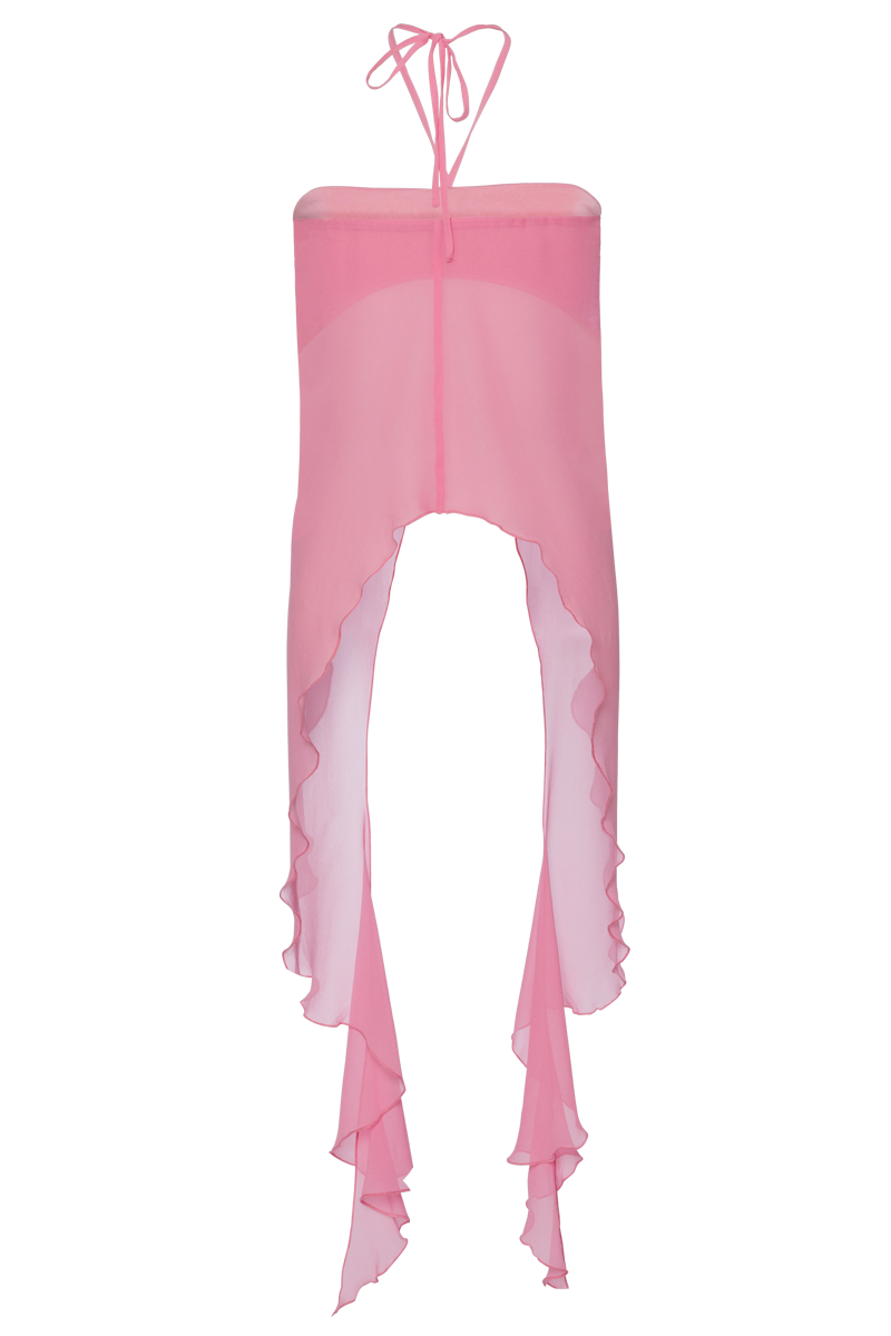 Raffiniertes Neckholder-Crop Top aus Seiden-Chiffoncrepe mit seitlichen Volants und handbesticktem AV-Motiv. Unterfüttert mit Seidenjersey.