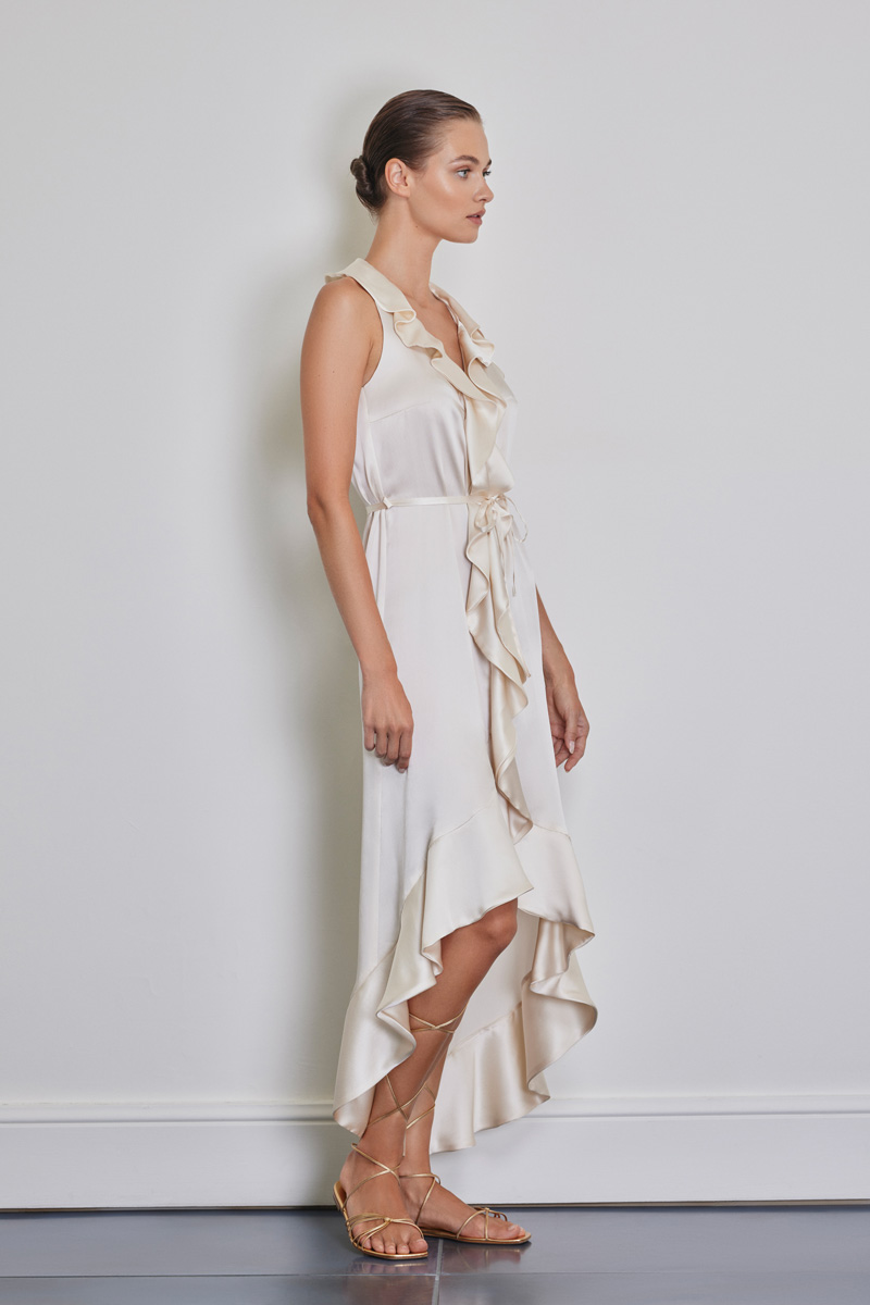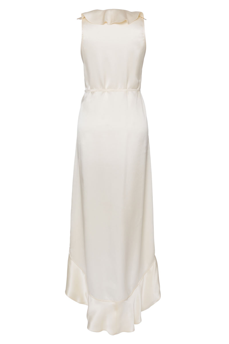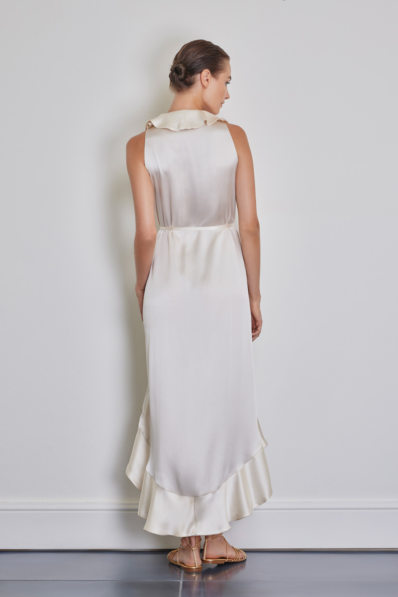 Fließender, bodenlanger Kaftan aus schimmerndem Seidensatin mit Volant-Ausschnitt. Häkchenverschluss vorne, mittig zu binden mit Bändchen.