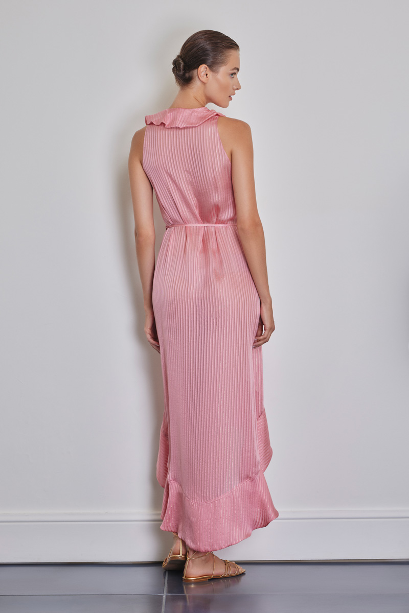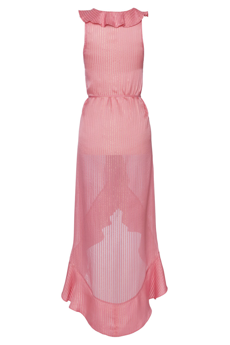 Fließender, bodenlanger transparenter Kaftan mit Volant-Ausschnitt aus Seiden-Chiffon mit Satinstreifen und goldenen Lurexfäden. Häkchenverschluss vorne, mittig zu binden mit Bändchen.