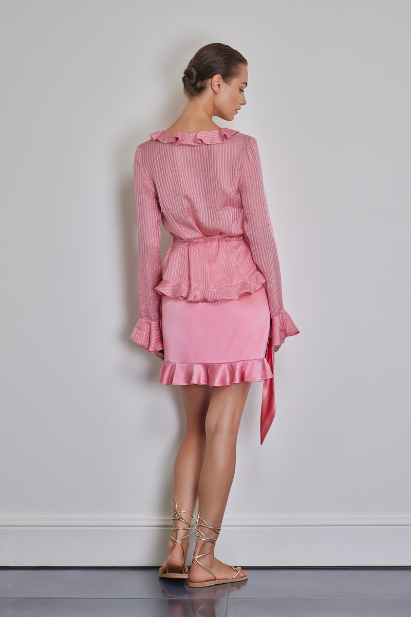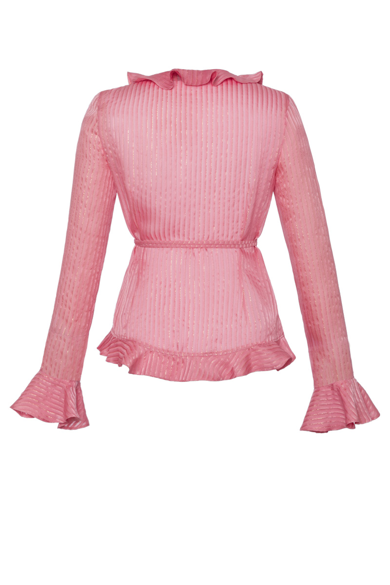 Verspielte luftige Seiden-Chiffon Bluse mit Satinstreifen und goldenen Lurexfäden. V-Ausschnitt mit goldenem Häkchen-Verschluss mit Strassstein. Raffinierte Volants-Details an Ausschnitt und Ärmeln. Integrierter, überlanger Gürtel zum Binden. Weich fallender Stoff, leicht transparent. Die Bluse hat einen lockeren Schnitt.