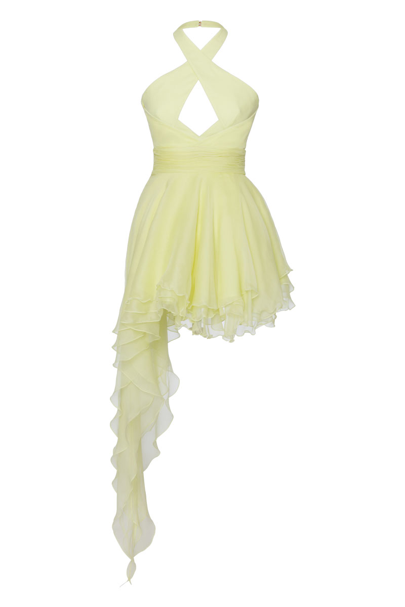 Figurbetontes Neckholder-Cocktailkleid aus Seide mit a-symmetrischem Schnitt und raffinierten Cut-Outs. 3-lagiger, luftiger Kreisrock mit seitlicher Verlängerung. Tiefer Rückenausschnitt. Häkchen-Verschluss im Nacken, versteckter seitlicher Reissverschluss.