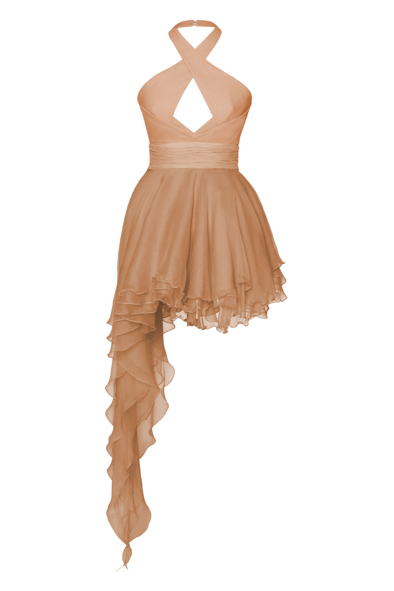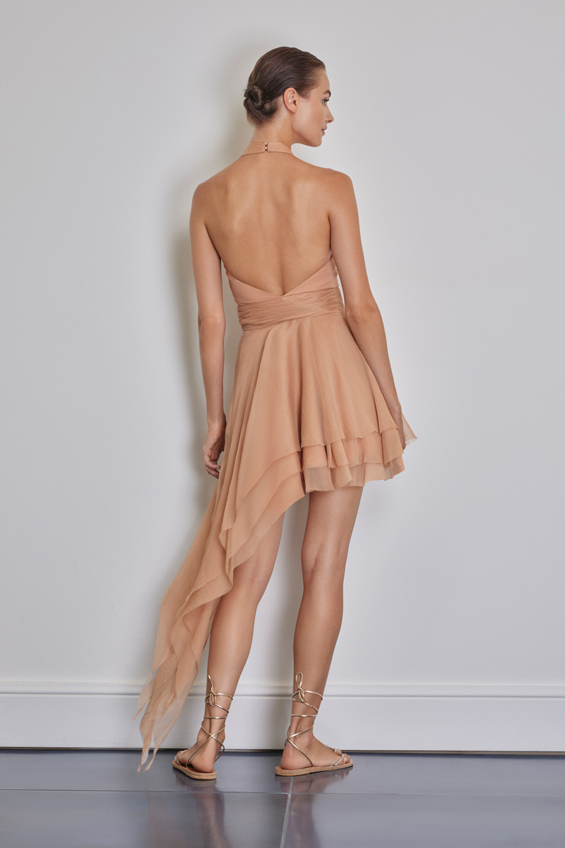 Figurbetontes Neckholder-Cocktailkleid aus Seide mit a-symmetrischem Schnitt und raffinierten Cut-Outs. 3-lagiger, luftiger Kreisrock mit seitlicher Verlängerung. Tiefer Rückenausschnitt. Häkchen-Verschluss im Nacken, versteckter seitlicher Reissverschluss.