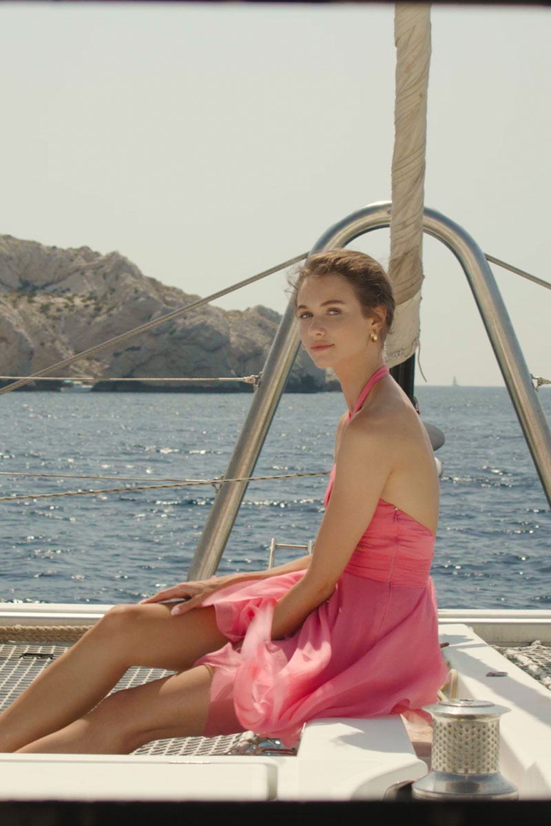 Figurbetontes Neckholder-Cocktailkleid aus Seide mit a-symmetrischem Schnitt und raffinierten Cut-Outs. 3-lagiger, luftiger Kreisrock mit seitlicher Verlängerung. Tiefer Rückenausschnitt. Häkchen-Verschluss im Nacken, versteckter seitlicher Reissverschluss.